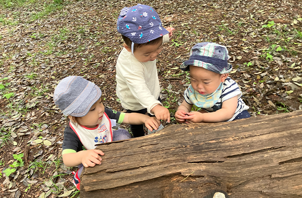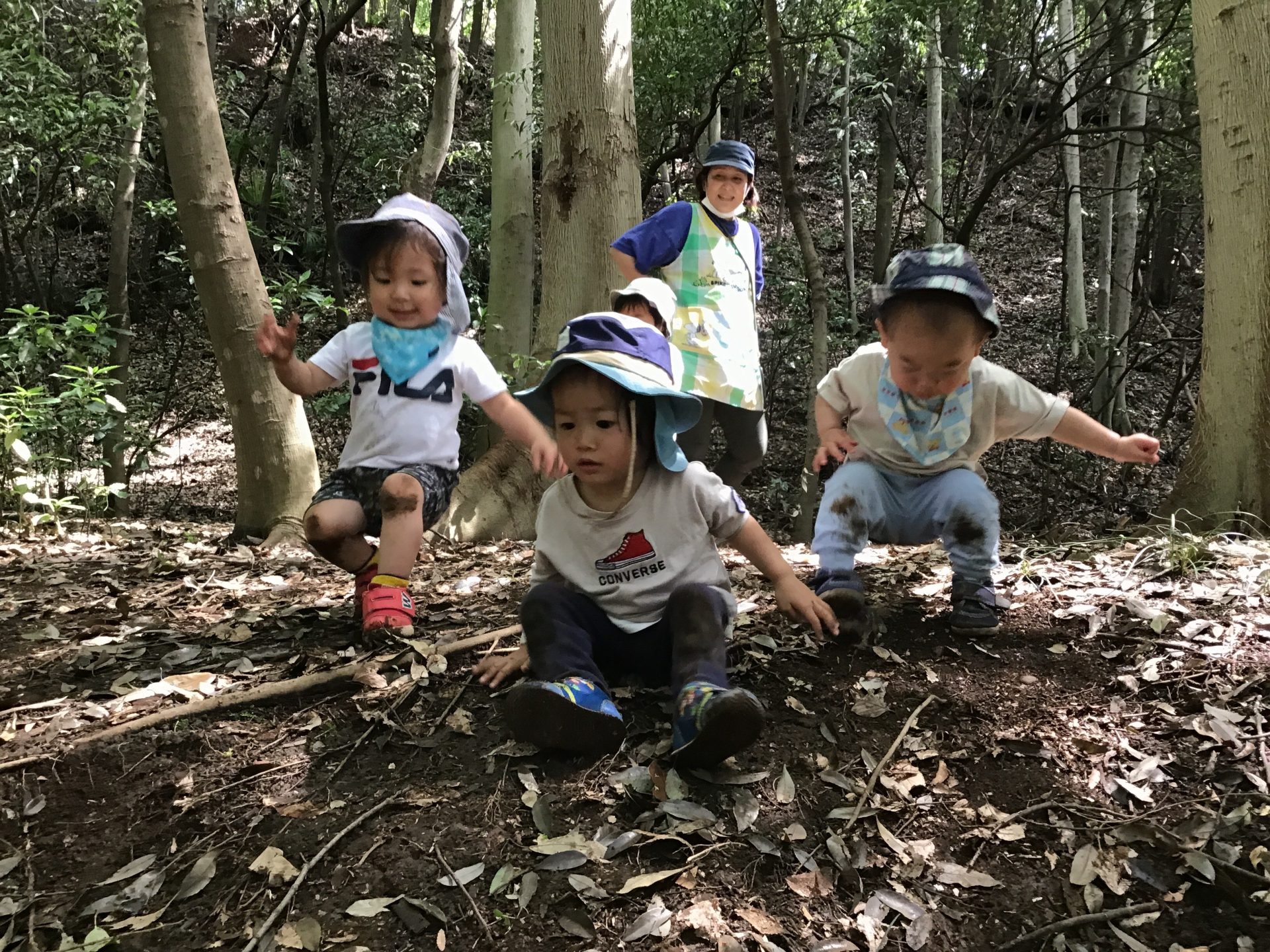 園庭にある遊具と違い崖は行くたびに表情が違います。雨の後は濡れて滑りやすかったり秋が終わる頃になると枯葉で覆われて足場が見えなくなります。落ちている葉っぱや枝も全く同じ形や色のものはありません。そんな中、子どもたちは崖に上ったり新たな遊びを見つけて遊びます。また、何故か自然の中にいると友だちと協力して何かを成し遂げようとする姿がよく見られます。子どもたちは、この自然遊びの中で五感や運動能力、情緒、社会性、そして自然への愛着を育み、小さな成功体験を重ねてゆくのです。この時期に自然の中で自由に遊ぶ経験を持つことで、子どもの将来の成長と学びに豊かな土台が築かれます。